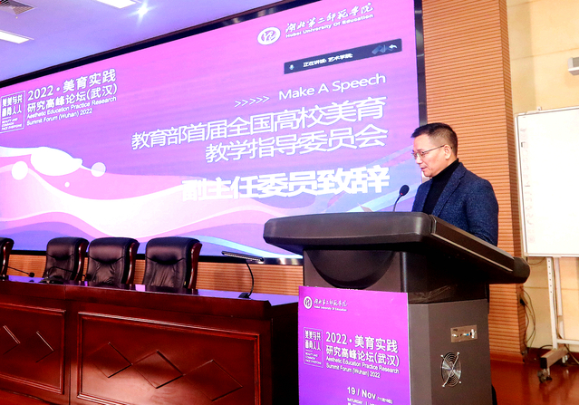 教育部美育教学指导委员会副主任委员、湖南师范大学二级教授、博士生导师郭声健教授代表全国高校美育教学指导委员在开幕式上致辞,对湖北第二师范学院所取得的美育成就表示祝贺。郭教授指出,湖北第二师范长期以来重视学校美育工作,积极探索美育学科建设、课程体系建设、大中小幼一体化美育实践模式的构建,受益学生不断增多,育人成效明显增强。郭教授明确指出:美育面向人人,是方向性问题,必须坚守;实践研究,是导向性问题,需要引领。美育本质属性是实践。评价美育研究成果,最终要看育人成效。唯有立足实践脚踏实地,全心全意服务学生,才能真正提升育人成效,实现以美育人、以美化人、以美培元的目标。