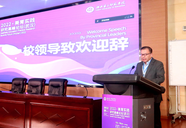 湖北省教育科学研究院院长傅华强在致辞中讲到:党的二十大报告指出,我们必须坚持自信自立,坚定道路自信、理论自信、制度自信、文化自信,以更加坚定的历史担当和创新精神,为新时代中国特色社会主义强国在教育、科技、人才做出新的贡献。美育,是坚定道路自信、文化自信的重要阵地。近年,湖北第二师范学院的教师教育优势特色学科做了大量工作,本次“美育美育实践研究高峰论坛”便是基于教师教育特色的“大中小一体化”美育系统成果的彰显。我们要共同续写新时代中国特色社会主义更加绚丽的华章,共同续写新时代美育的美好篇章。