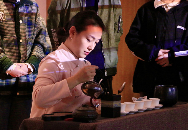 讲座中,为加强听众对茶文化的理解,韩莹莹还邀请了湖北省高级茶艺师何兢兢到现场进行了精彩的茶艺表演。茶艺师选茗择水展示茶具,随后烹茶,动作优雅端庄,一气呵成。“今天呈现的是一款云南古树红茶,闻香带着山野气息,春天的甜蜜尽显其中。在叶片灿烂的舒展下,也让香气里的内涵物质更好地释放。”韩莹莹讲解到。