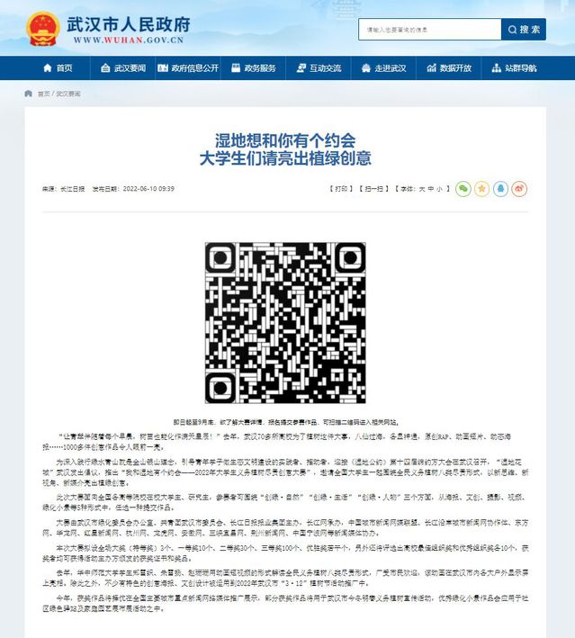 本网讯(通讯员付丹)为深入践行绿水青山就是金山银山理念,引导青年学子做生态文明建设的实践者、推动者,迎接《湿地公约》第十四届缔约方大会在武汉召开,“湿地花城”武汉发出倡议,推出“我和湿地有个约会——2022年大学生义务植树尽责创意大赛”,邀请全国大学生一起围绕全民义务植树八类尽责形式,以新思维、新视角、新媒介亮出植绿创意。