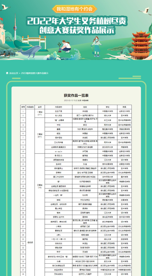 2023年初,组委会公布了大赛获奖名单。来自同济大学、中国美术学院、鲁迅美术学院等13个省市101所高校的学生共征集海报、文创作品、视频等设计作品1603件。我校艺术学院动画专业学生关斌凯等同学和团队共获得13项大奖,艺术学院获得优秀组织奖,高飞老师获得最佳指导教师奖。