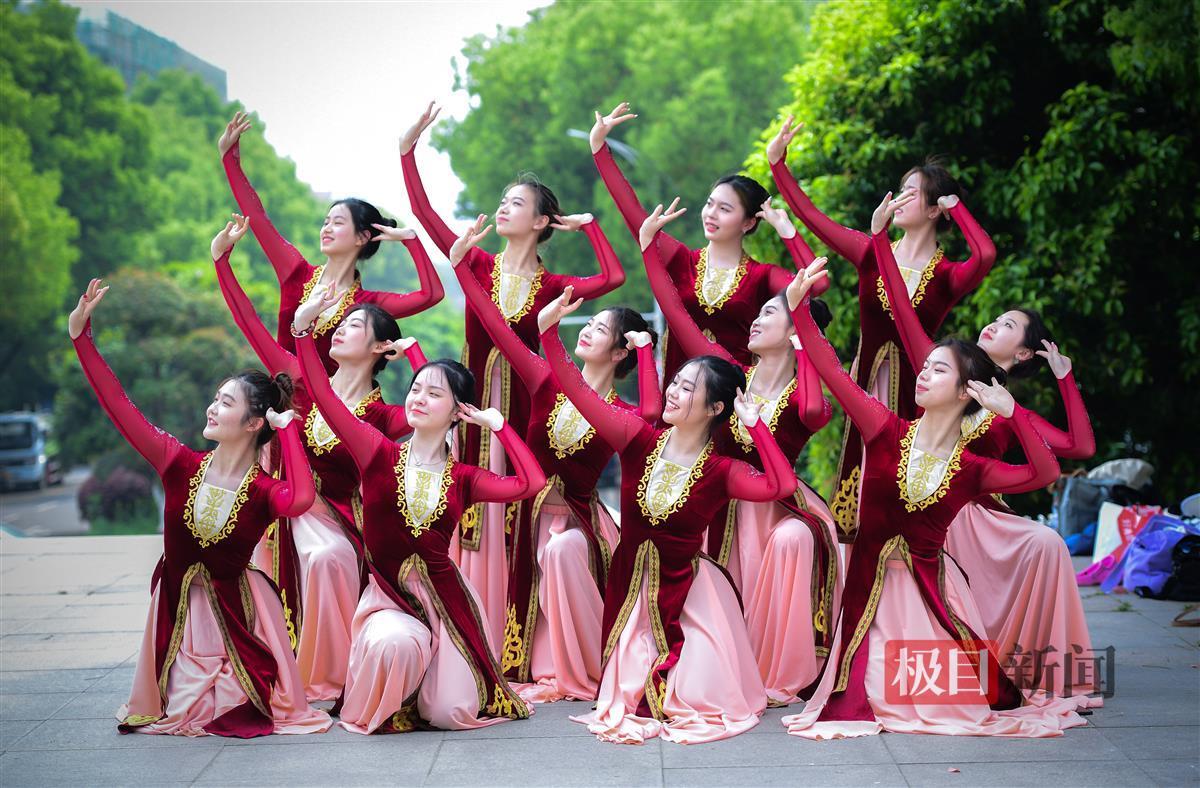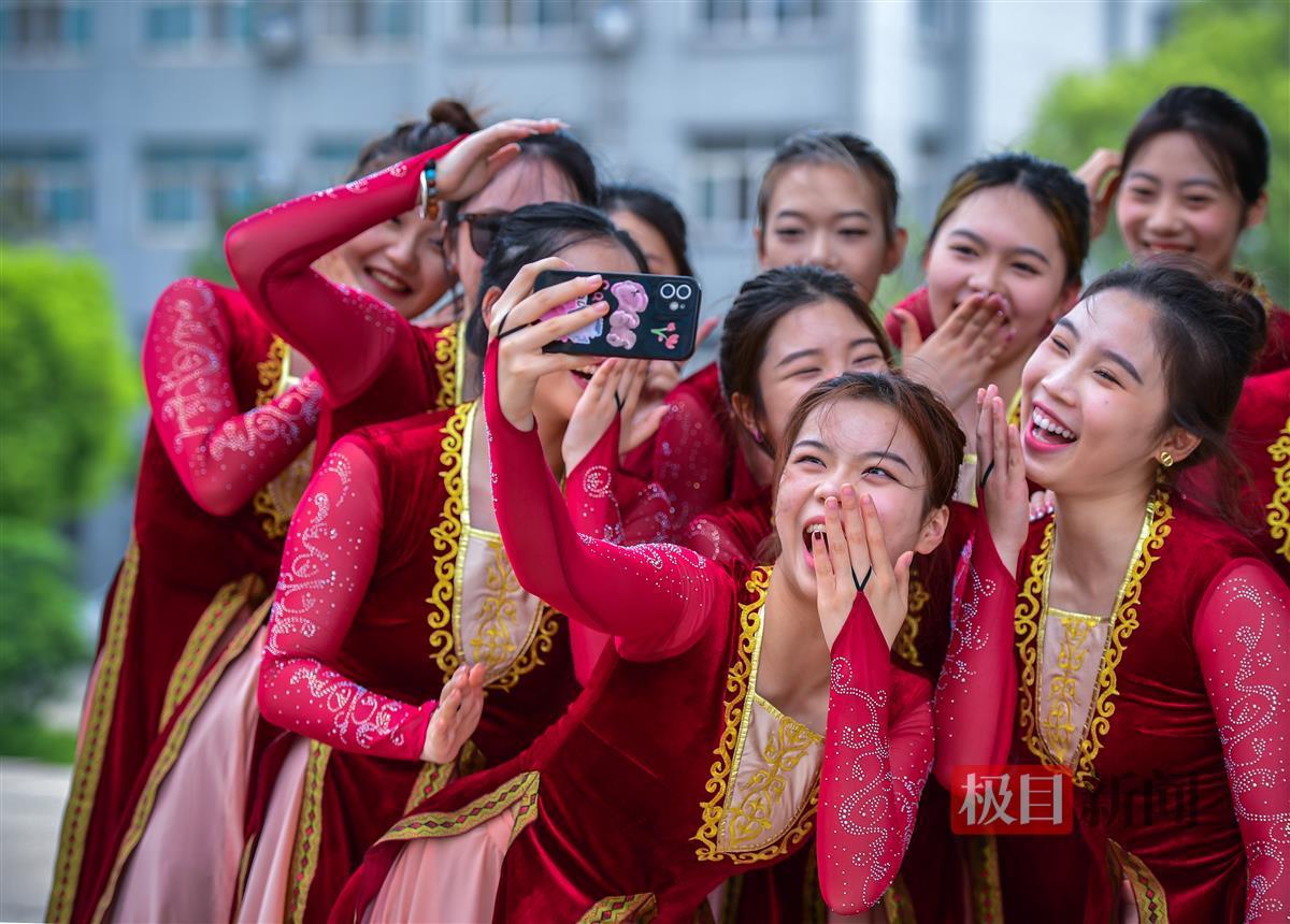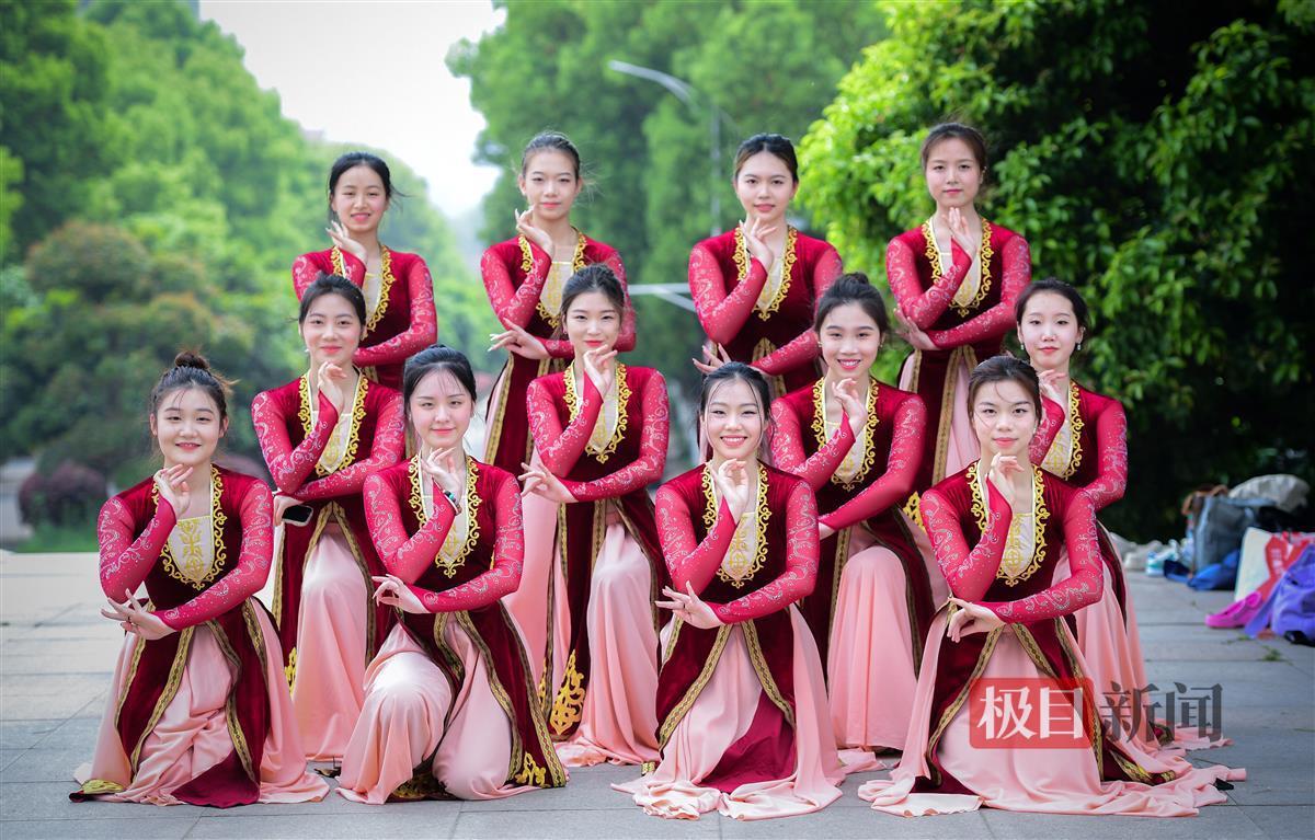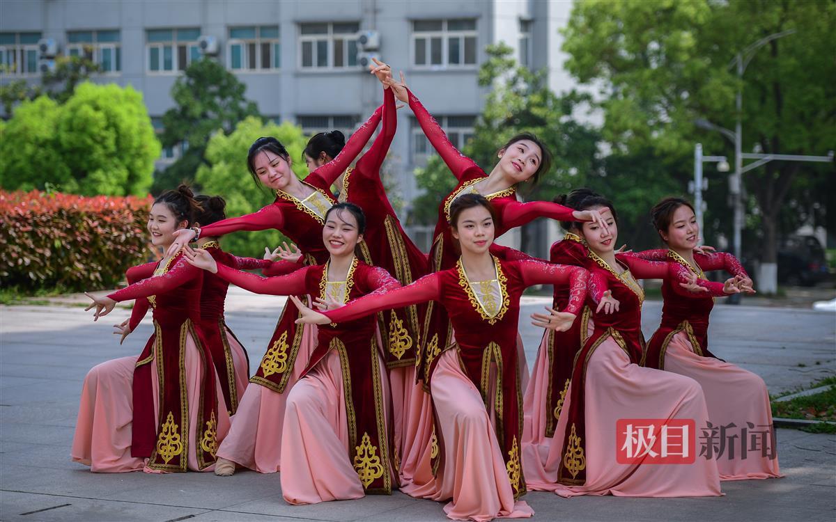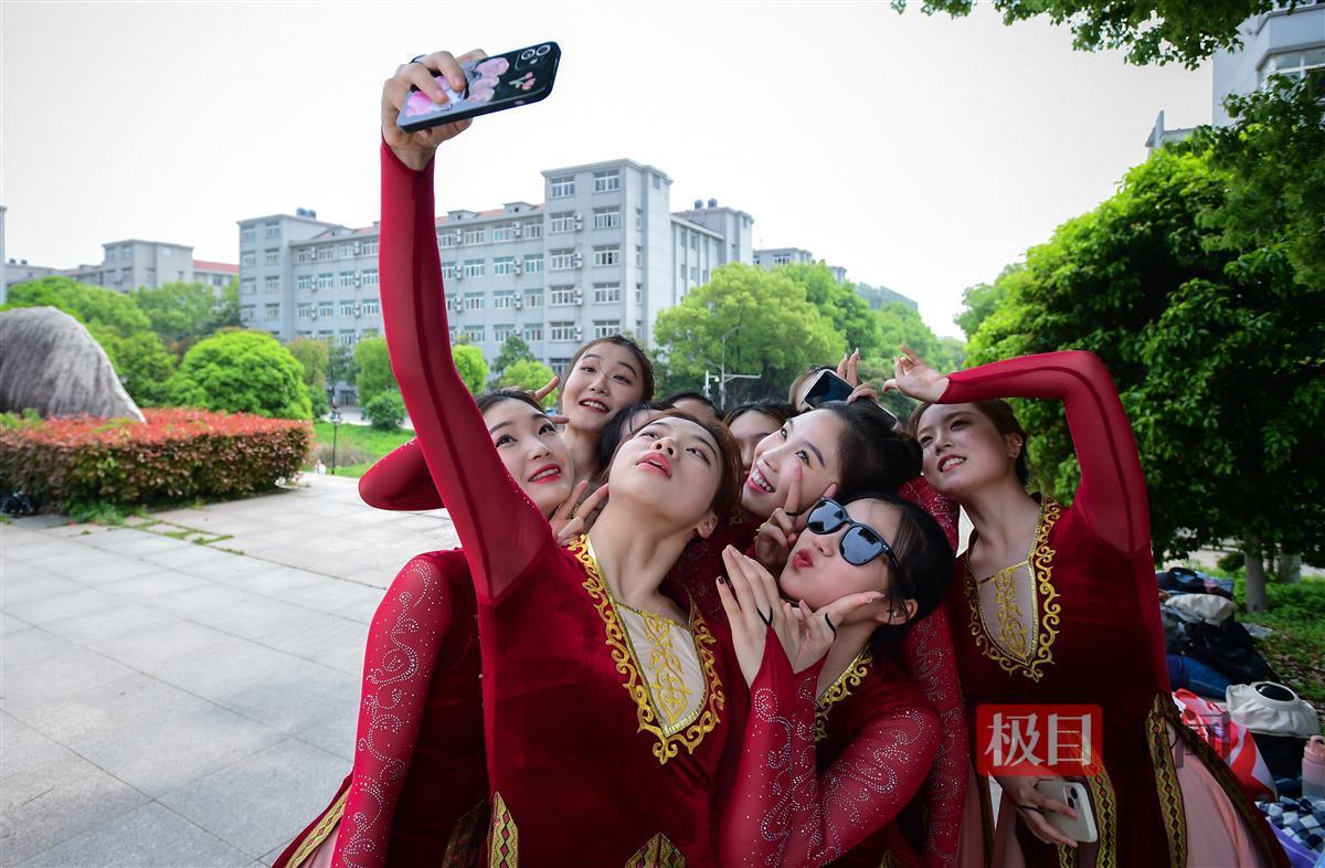 4月12日,湖北第二师范学院图书馆前的广场上,身着统一服饰的女生们翩翩起舞,优美灵动的舞姿很快引来同学们围观。休息空隙,她们还摆出各式舞蹈造型,合影留念,留住她们在校园内绽放的青春。