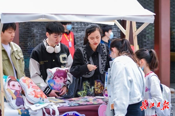 带队老师刘佳尼介绍,创意作品包括钥匙扣、帆布包、冰箱贴、徽章、抱枕等,都是由大学生自己开发设计的作品,其中包含了湖北元素、武汉元素、武汉旅游文化元素,学生们把这些元素与现代设计思路有机结合,制作成这些独具一格、立意新颖的作品,在黄鹤楼“摆摊”推销,受到了游客的热情选购。(长江日报记者史伟 摄影报道)
