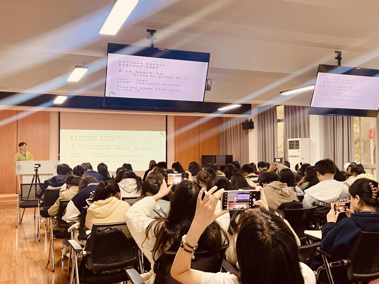 “趣味化的课堂更有利于激发孩子们对事物的兴趣,进而进阶成专业学习。”许乐乐向我们强调以童真童趣、游戏化等多种艺术形式融合为呈现方式的舞蹈教学活动,可以让孩子充分感受舞蹈的魅力,优化孩子们的形体健美和肢体协调度,挖掘孩子潜能,促进未来更好发展。讲座的互动环节中,许乐乐借助案例视频进行现场教学,同学们积极配合互动,讲座氛围轻松有趣。