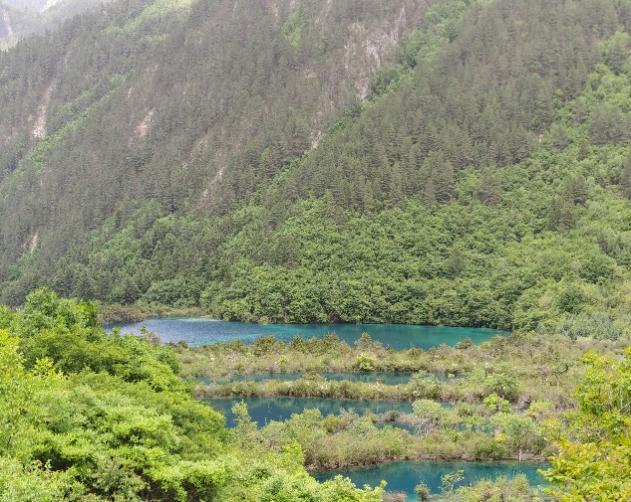 5月23日早晨,我们沿着岷江的源头,沿着弯曲的山道,碗蜒而上。一边是清清的河水,随着山势,溪流时而宽,时而窄,时而缓,时而急。溪声也时时变换调子,好似正在演奏迎宾曲。九寨沟有大大小小的118个海子分布在其中,关于海子,当地流传着一个传说,:从前,天上有一个美丽的女神,一个羌族牧羊人十分喜欢她,就给她一面魔镜,并对她说:"你如果喜欢它,就请随身带着。"可女神有一次不细心忘带了。那个镜子便四分五裂的在九寨沟的土地上变成了今日的海子。