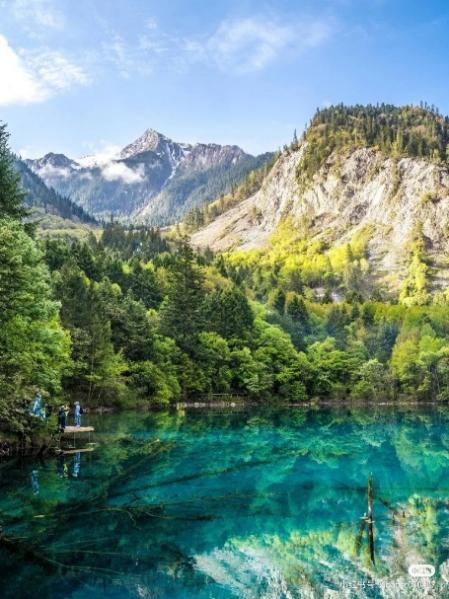 从未见过如此清澈、如此透明、如此色彩斑斓的水。远远望去,那山上色彩鲜亮,颜色分明的植物都清晰的倒映在水中。山顶是墨绿色,绿色,与蓝天白云相连,显得更加明亮,依次是淡绿、浅绿,绿色之间镶嵌着淡黄色、金黄色、红色。搭配与衔接都是那么的自然流畅。就像是人工精心雕琢的画面,那么和谐,那么完美;又像是画家笔下的一幅绝美的山水画。