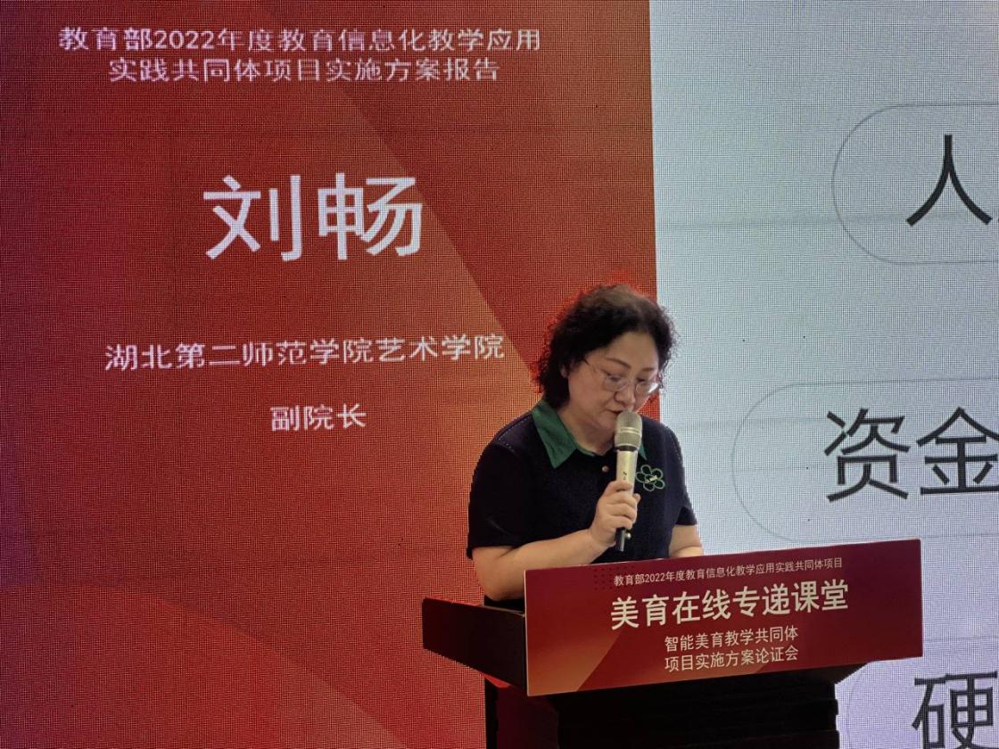 会议第二项实施方案报告环节,湖北第二师范学院艺术学院副院长、牵头单位项目负责人刘畅教授陈述了项目总体实施方案,武汉市光谷第三小学的王彩云校长和武汉市光谷实验中学的贾锐老师作为共同体成员单位,用图文并茂的方式生动呈现了各校智能美育教学成果和未来发展规划。