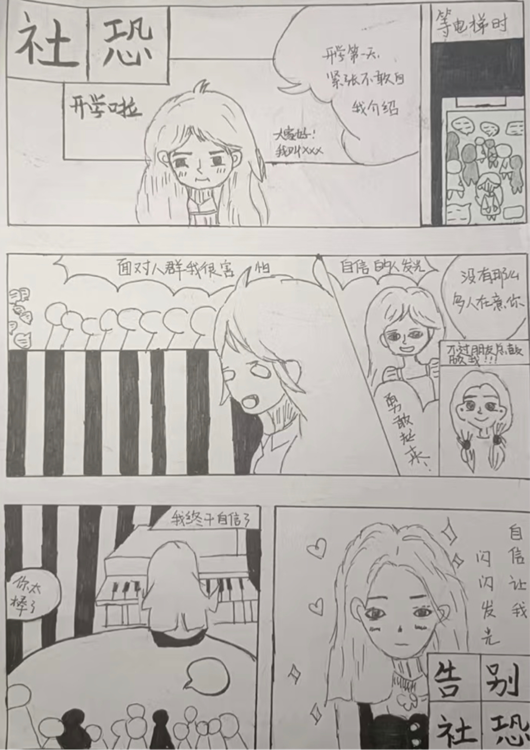 本次心理漫画展活动,同学们热情高涨,收到22幅参赛作品。参赛者们用漫画的形式,或彩色或黑白,将其在大学的所感所想生动形象地展现出来,作品内容健康、积极、向上,主题涉及刚入大学时的困惑、友谊、童年、目标等方面,为表现出了大学生活、学习、情感等活动中的心理困惑、心理感悟。
