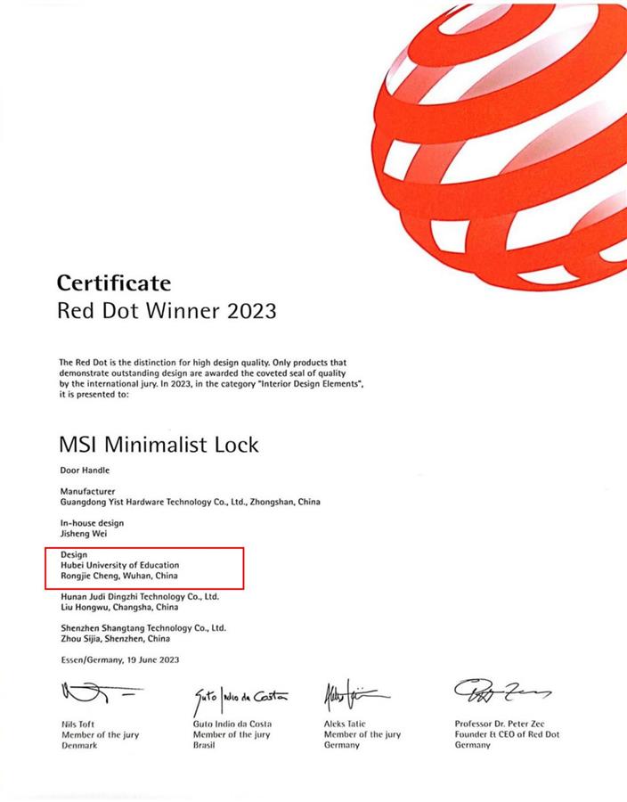 近日,德国红点奖(Red Dot Award)2023年度获奖名单正式揭晓,湖北第二师范学院艺术学院视觉传达设计系程蓉洁副教授与企业合作设计选送的作品《MSI极简锁》,获2023年国际顶级设计大奖德国红点设计奖(red dot award 2023winner)。