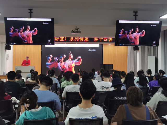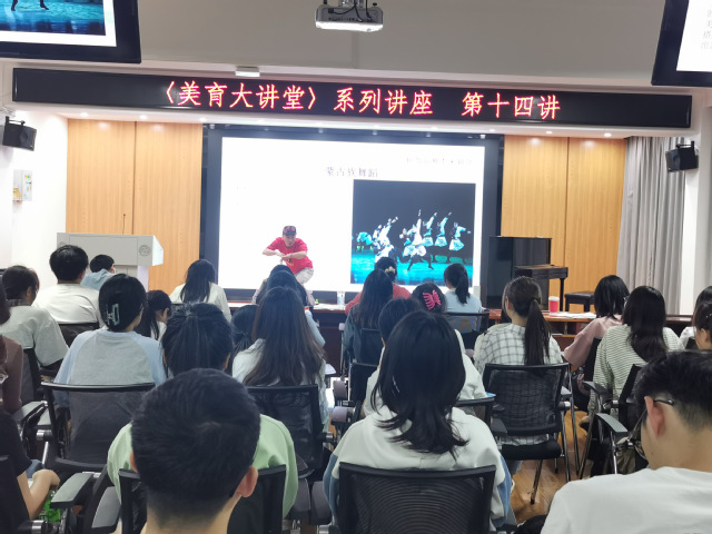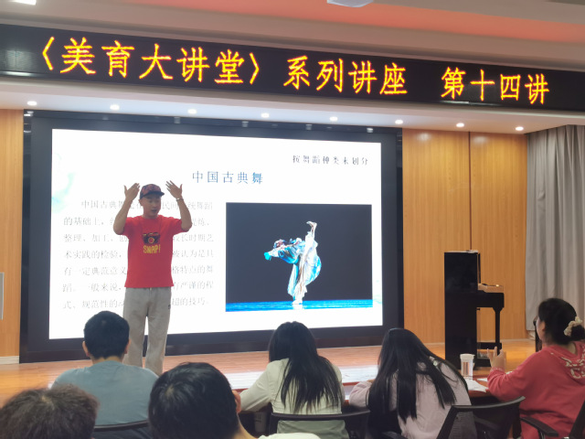 本次讲堂主讲人为国家二级演员、副教授——艺术学院马玉江老师。讲座现场气氛热烈、座无虚席。马老师以专业的舞蹈知识和丰富的舞台实践经验,为来自学校《大学美育》课程的学生打开了舞蹈世界的大门,带领他们一起认识我国不同舞种,共同品鉴舞蹈艺术之美。