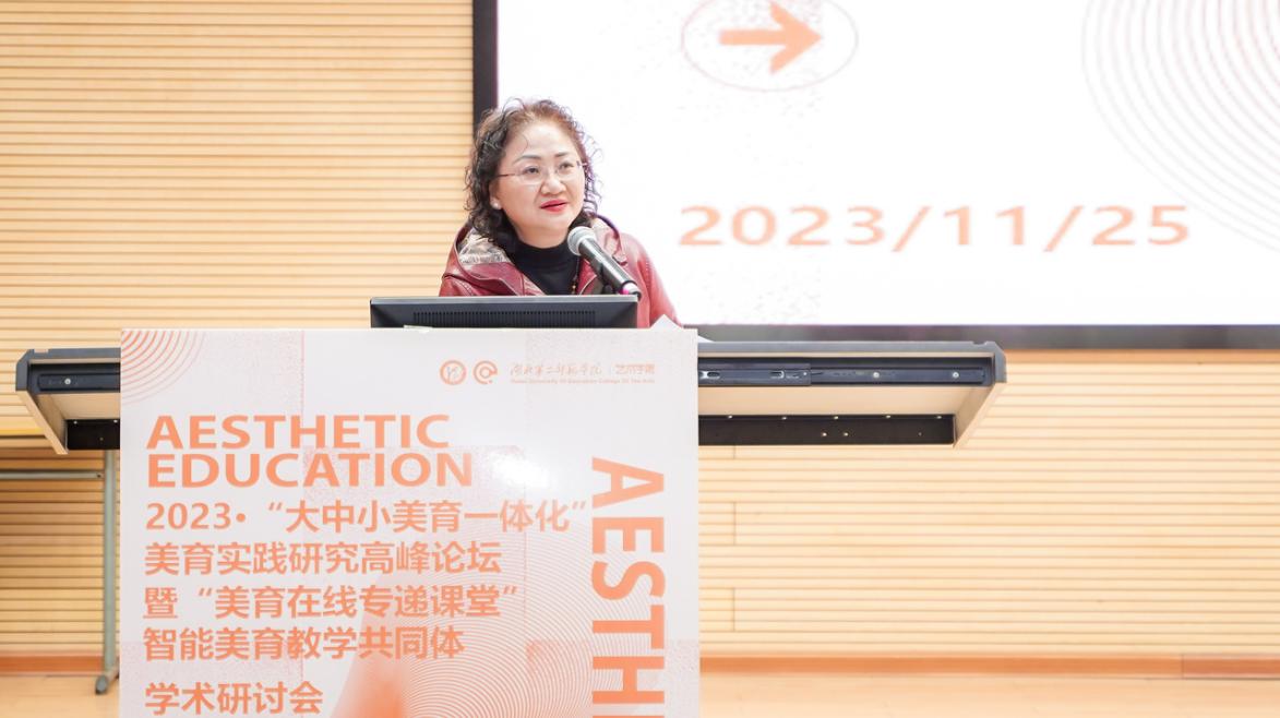 [通讯员 寇琰]2023年11月25日,2023·“大中小美育一体化”美育实践研究高峰论坛暨“美育在线专递课堂”智能美育教学共同体学术研讨会在湖北第二师范学院图书馆二号报告厅、一号报告厅举行。刘畅教授做主题发言:共建共享 融合创新——智能美育教学共同体实践模式构建。