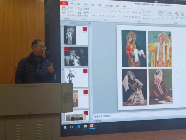 封杰教授以《“外行人”眼中的京剧—<京剧宿>中的文与德为题,深入浅出地讲解了戏曲的历史渊源、艺术特点和表演形式具体讲述了京剧的发展历史,介绍了京剧前身徽班并向同学们提问“徽”字的具体含义介绍了最初发展京剧的戏班—“三春”,并向大家展示了该戏班旧址图片展示了《同光十三绝》画像,该画绘有老生、武生、小生、青衣、花旦、老旦、旦角,均是画家选择的清代同治、光绪年间徽调、昆腔的徽班进京后扬名的13位著名京剧演员,程长庚、谭鑫培、卢胜奎、张胜奎等