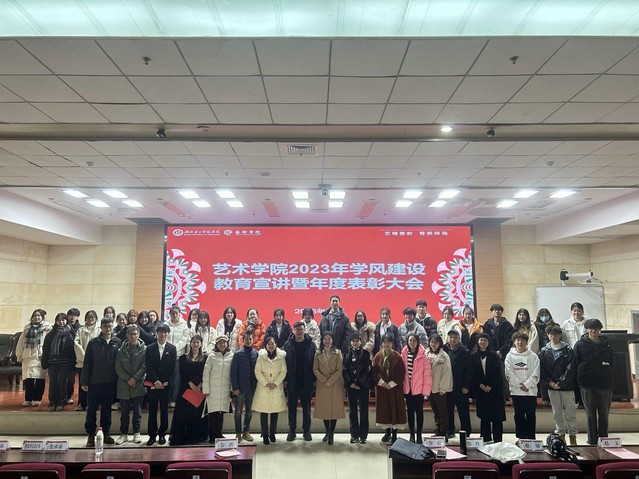 本网讯(通讯员 王远程)2023年12月14中午,艺术学院“2023年学风建设教育宣讲暨年度表彰大会”在图书馆1号报告厅举行。艺术学院党委书记章倩、院长金波、党委副书记邵玲、副院长刘畅、副院长赵文、院长助理谢敏出席会议,全体辅导员及获奖代表、大一新生参加会议。会议由刘岚格和王傲主持。