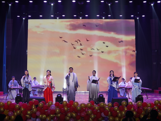 艺术学院领导班子与古筝器乐学生共同演绎的配乐诗朗诵《渔舟唱晚》将晚会推向了高潮,生动诠释了自然与人文的壮丽景象,传达了对国家和人民的深厚感情和对未来发展的美好愿景。