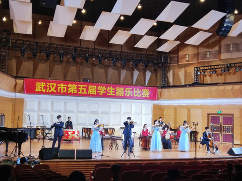 图为实习生与实习学校老师一同带队学生去武汉市青少年宫参加第五届学生器乐比赛