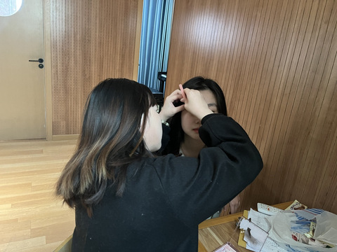 图为实习生黄佳颖与学生在排练休息时谈笑风生