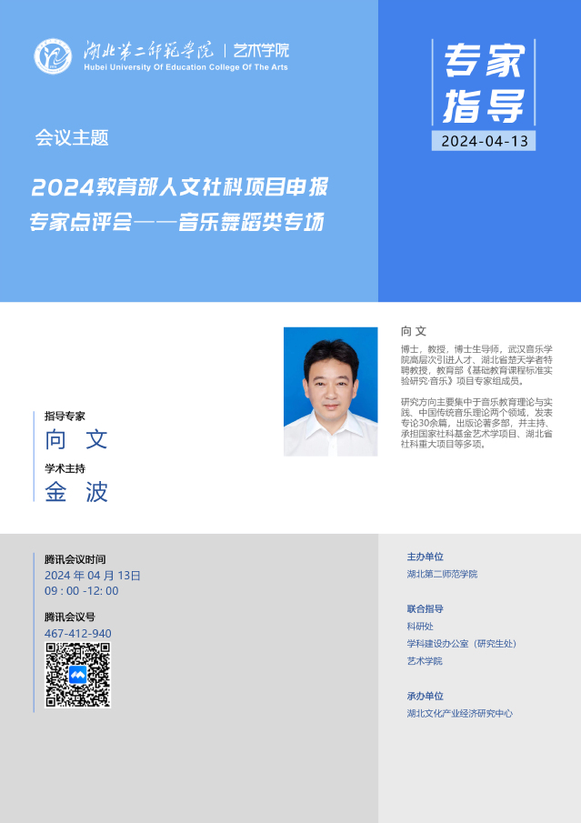 4月13日上午,受学院邀请,武汉音乐学院博导向文教授对我院教育部人文社科项目申报书进行逐一点评指导。评阅指导会线上举行,由艺术学院院长金波教授主持。