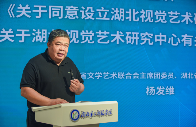 湖北第二师范学院艺术学院院长金波代表湖北视觉艺术研究中心发言,提出并构建了研究中心的愿景和发展设想,学院将紧密结合自身特点,充分发挥特色与优势,进一步加强视觉艺术学科建设,全面支持中心的建设工作。