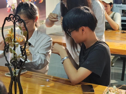 图为谢静副教授及团队成员杨丹、苏熠、王婷耐心向同学们示范缠花细节并纠错。同学们认真听讲,学习新知识,并在亲手制作中感受了非遗之美,在传承非遗文化的同时,“解锁”了新技能。