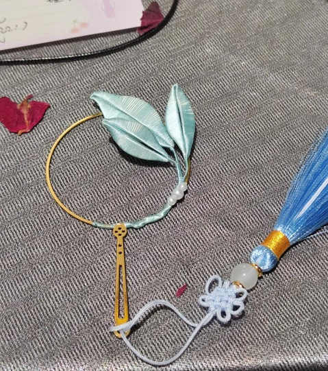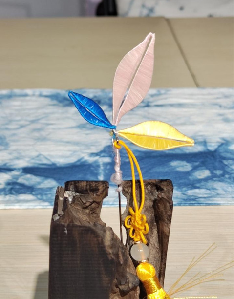 图为杨丹为同学们已经缠好的叶片进行组装,不一会儿,一个精致的小扇面就制作完成了。