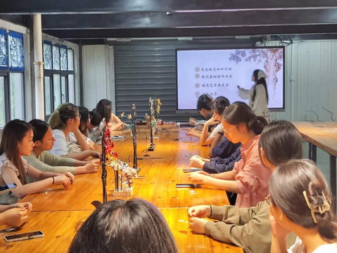 图为主讲人杨丹播放缠花制作视频,同学们共同学习和欣赏英山缠花制作的详细过程。主讲人杨丹向同学们详细示范缠花的过程与技巧,同学们认真听讲,积极实践。
