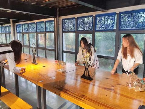 图为工作坊团队成员在进行课前的准备工作,成员们将缠花所需的铜丝、纸板、胸针、剪刀、扇面一一摆放整齐。