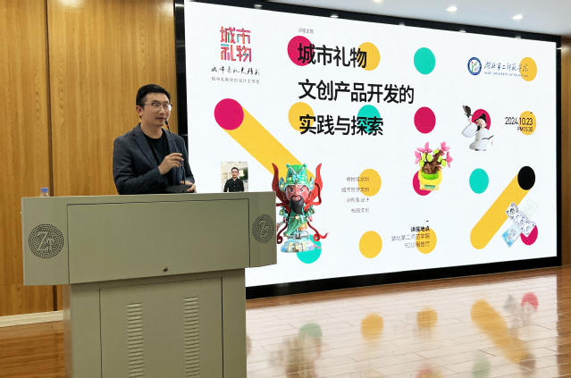 嘉宾王伟以“城市文创产品开发的实践与探索”为主题展开分享。他为同学们呈现了他大学毕业后就开启了设计精彩人生,包括他的标志设计、博物馆文创、城市旅游文创、ip 设计、校园文创等方面大量的成功案例,犹如一场精彩绝伦的设计盛宴。在标志设计分享环节,王伟老师介绍了他独特的“课程加比赛加商业项目”的教学模式,以及“专注做好一件事”的个人标签。在博物馆文创分享中,他讲述了在“辛亥之翼——辛亥革命衍纸设计”项目中的经历,发现学生折纸能力突出后,鼓励学生大胆尝试将衍纸与博物馆文创相结合,使作品既具特色又能展现博物馆主题。在 ip 设计分享时,王伟老师提到在教学过程中会善于发掘学生的闪光点,并在此基础上为学生打造专属 ip 形象,以此架起师生之间的沟通桥梁。王伟老师还分享了自己的设计心得——“设计是一种不断挖掘探索自己的过程!”激励学生不仅要完成设计,更要追求做好设计。