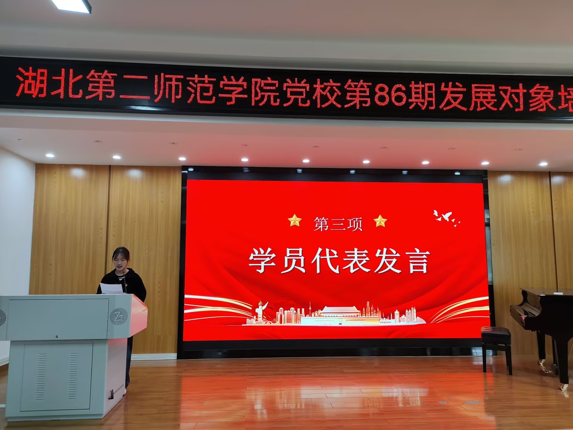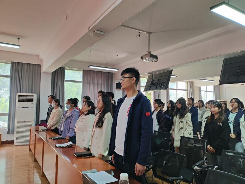 活动在全员合唱《国歌》的激昂旋律中拉开帷幕。随后,学生第三党支部学员代表管妞进行了发言。