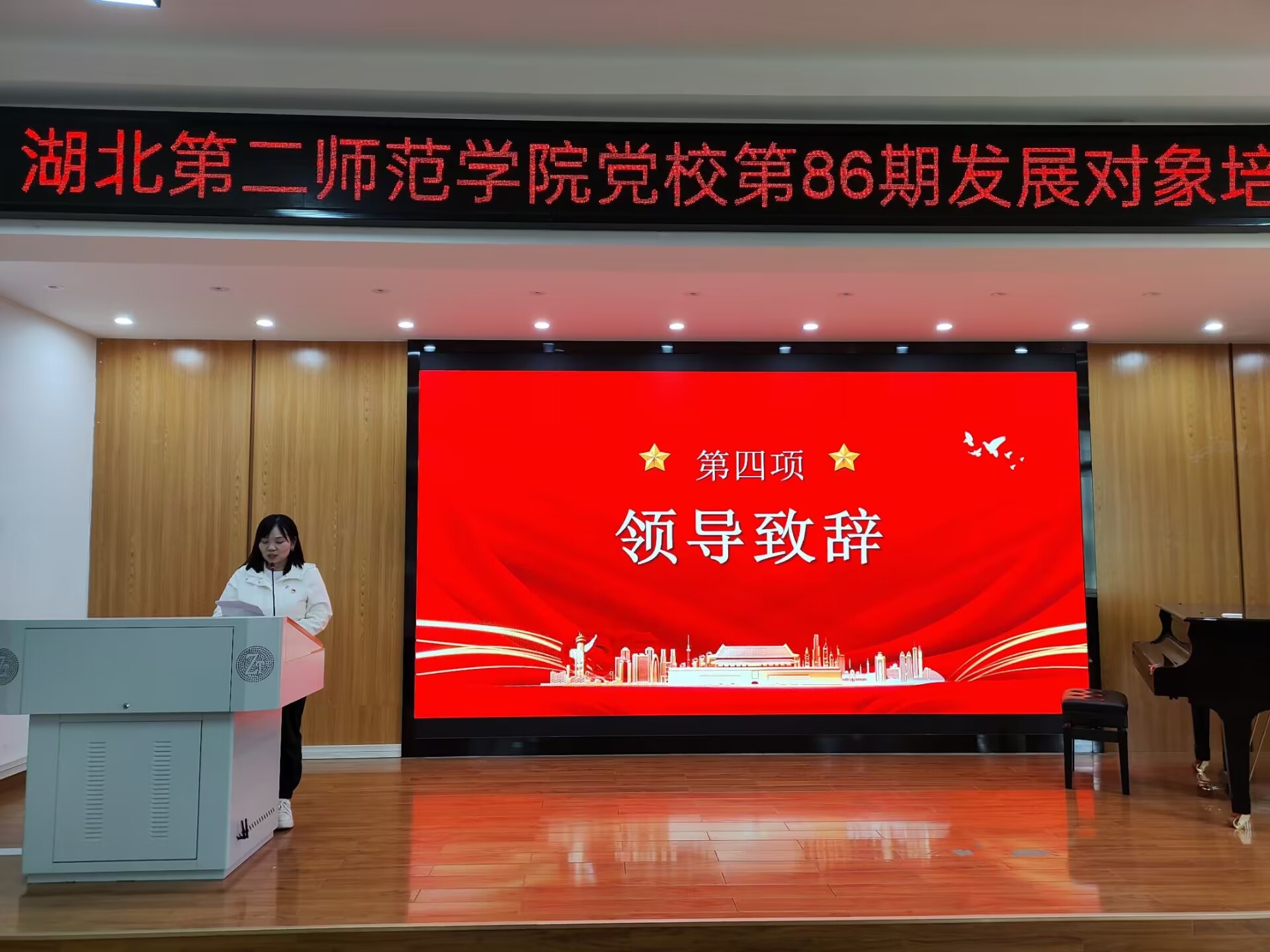 (通讯员 余秋月)扬帆启航,共绘新篇。2024年11月4日12时20分,湖北第二师范学院党校第86期发展对象培训班与第59期预备党员培训班开班典礼在9210召开。出席典礼的有艺术学院党委副书记邵玲书记,以及学生第一党支部书记宦忠虎老师、第二党支部书记张豫老师、第三党支部书记骆夏君老师,艺术学院全体辅导员老师也列席参加。本次典礼由学员代表余秋月担任主持。