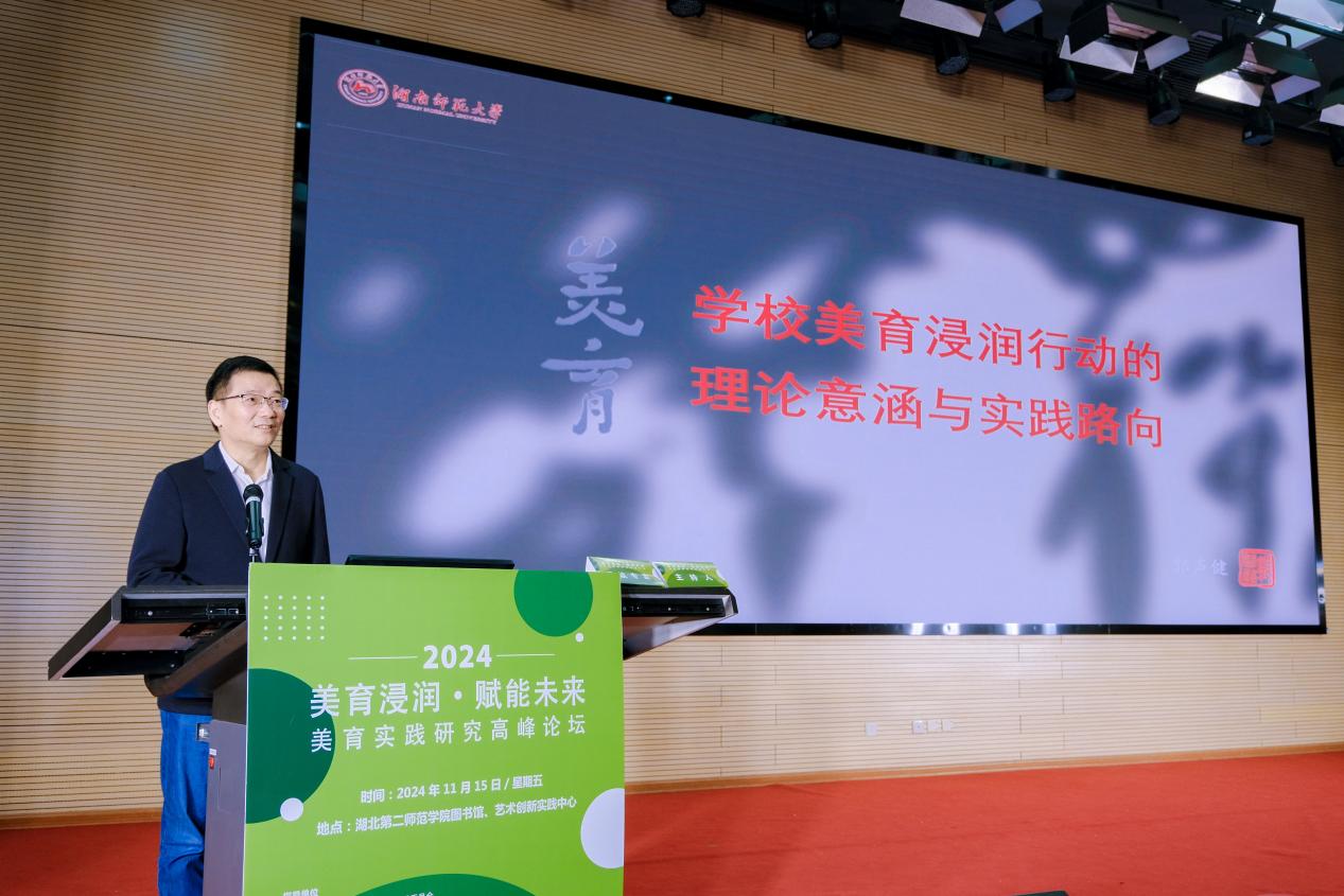 (通讯员 寇琰)2024年11月15日,2024·“美育浸润·赋能未来”美育实践研究高峰论坛在湖北第二师范学院图书馆二号报告厅、艺术创新实践中心举行。湖南师范大学教授、博士生导师,湖北第二师范学院特聘教授,教育部艺术教育委员会副秘书长,教育部首届全国高校美育教学指导委员会副主任郭声健教授做主旨发言:学校美育浸润行动的理论意涵与实践路向。