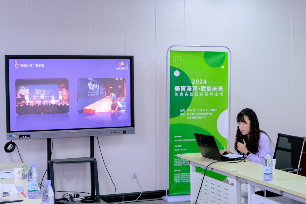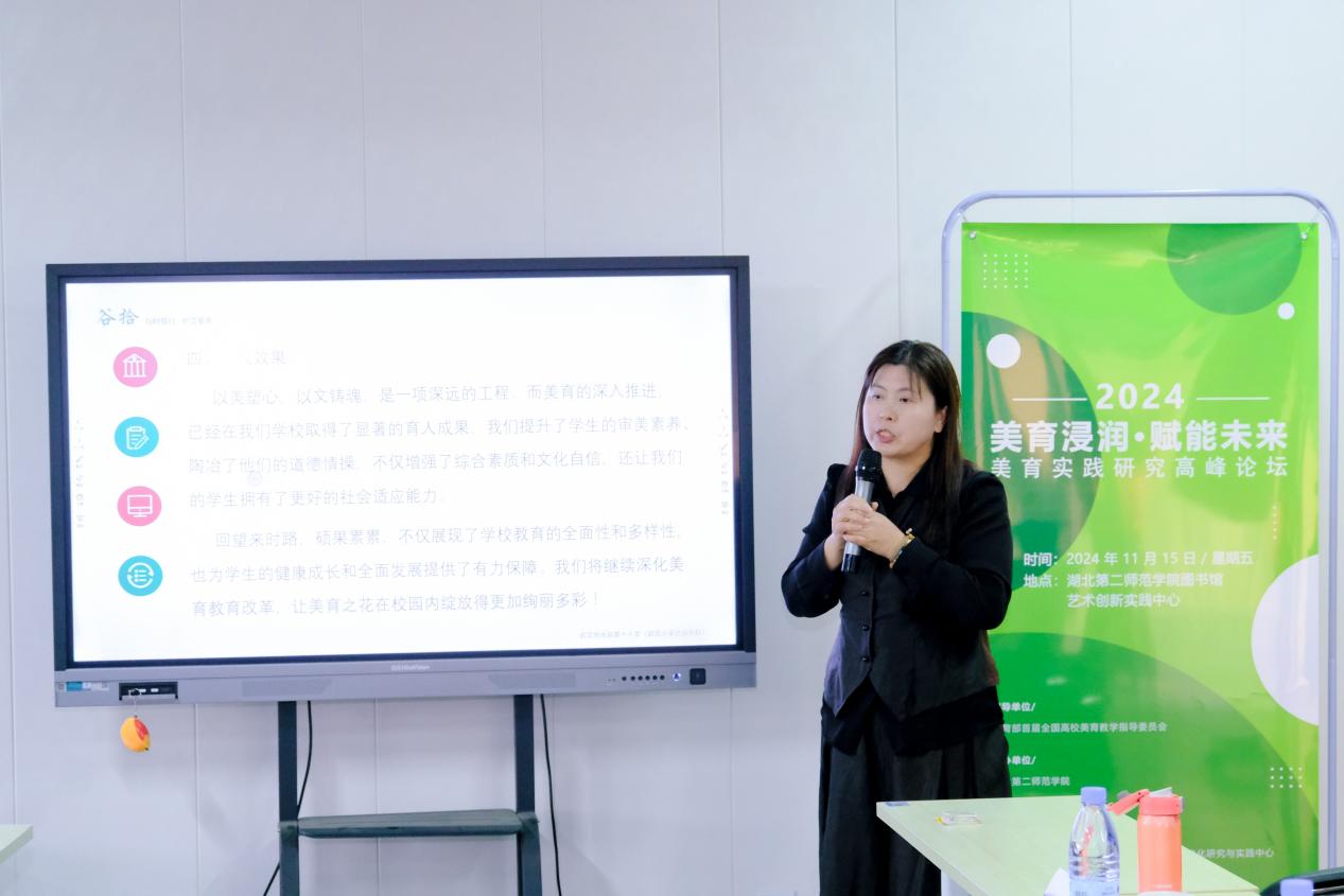 武汉光谷第二高中王莉莉老师的发言主题是《“以美为基,以乐育人”理念指导下的音乐实践探究》。王老师陈述了通过视唱活动、歌词诵读、音乐鉴赏方式提升学生音乐素养的具体做法;提出促进音乐教学的情境化、信息化、生活化,让环境感染学生;陈述了音乐教学中融合音乐文化、体验节奏游戏、开展创编活动的实施过程。王老师呼吁:一线教师要秉性“以美为基以乐育人”理念,探索更多美育的可能性,将美育贯穿音乐教学的始终,不断完善和优化教学形式与方法,以有效落实育,培养更多优秀的音乐人才。