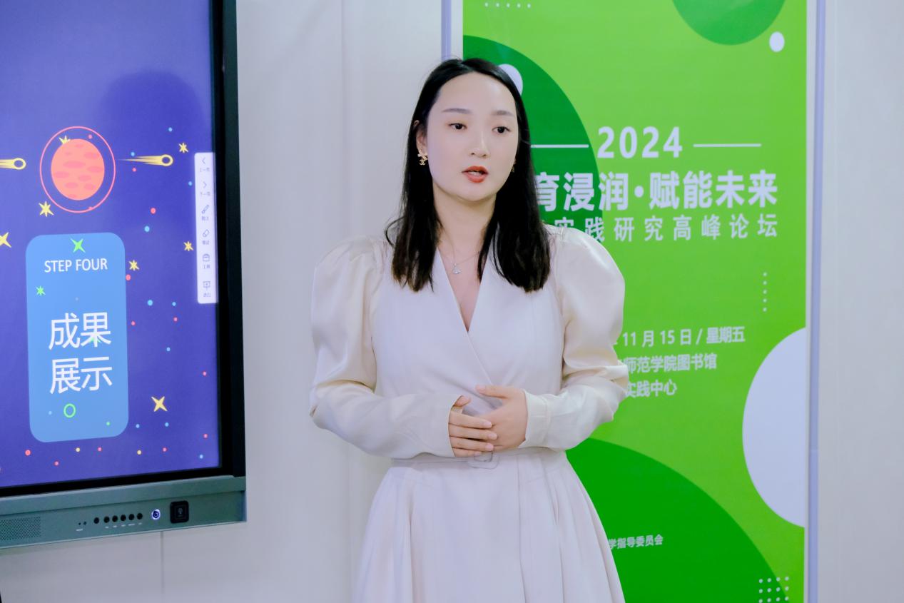 武汉光谷第三小学范肖洁老师的主题发言围绕《“和乐”戏曲体验馆沉浸式美育实践研究》展开。范老师从两个问题:基于“双减”背景的美育提升学生艺术素养的需要、学校办学理念“在和乐中创新发展”的需要出发,陈述了“和乐教育”、“戏曲课程”、“课程融合”三个核心概念,展示了“四位一体”的“和乐”融合课程模式、“三课三促”协同推进“和乐”戏曲课程的实施策略和实践路径及开发的“和乐”戏曲资源、戏剧课堂评价标准,总结了该研究的成效:提升了教师教学水平、增强了学生的艺术素养、促进了学科融合创新,助推了学科融合创新。