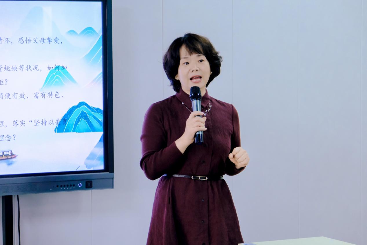 湖北省水果湖一小校长马新银的主题发言是《让和美浸润在日有所长中》。马校长从《中华人民共和国教育法》中关于党的教育方针其中“教育必须为社会主义现代化建设服务、为人民服务,必须与生产劳动和社会实践相结合,培养德智体美劳全面发展的社会主义建设者和接班人”和美育浸润为起点,解读了水果湖一小办学理念在学校的生动、细致沉淀。学校标识围绕“水”“一”“小”三个汉字创作,整体是一棵大树,象征学子们未来是国家的栋梁。水一小“和教育”指导思想“德”定方向、“智”长才干、“体”健身躯、“美”塑心灵、“劳”助梦想;核心素养包含正确价值观、必备品格、关键能力。水一小坚持以“和美浸润”作为美育工作的目标,构建“以美立德、以美启学、以美促创、以美怡情”的美育育人体系,打造“和美”新育人平台,以美立德;构建“和美”新课程体系,以美启学;创新“和美”新课堂实践,以美促创;推进“和美”新场域融合,以美怡情。马校长的结束语“春播夏耘,秋收冬藏,顺应四时,遵循规律,才是教育最好的模样”生动了呈现了水果湖一小全体教师脚踏实地推进美育的初心。
