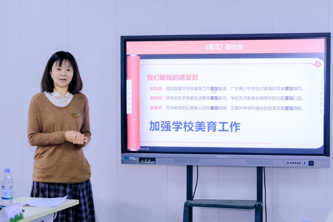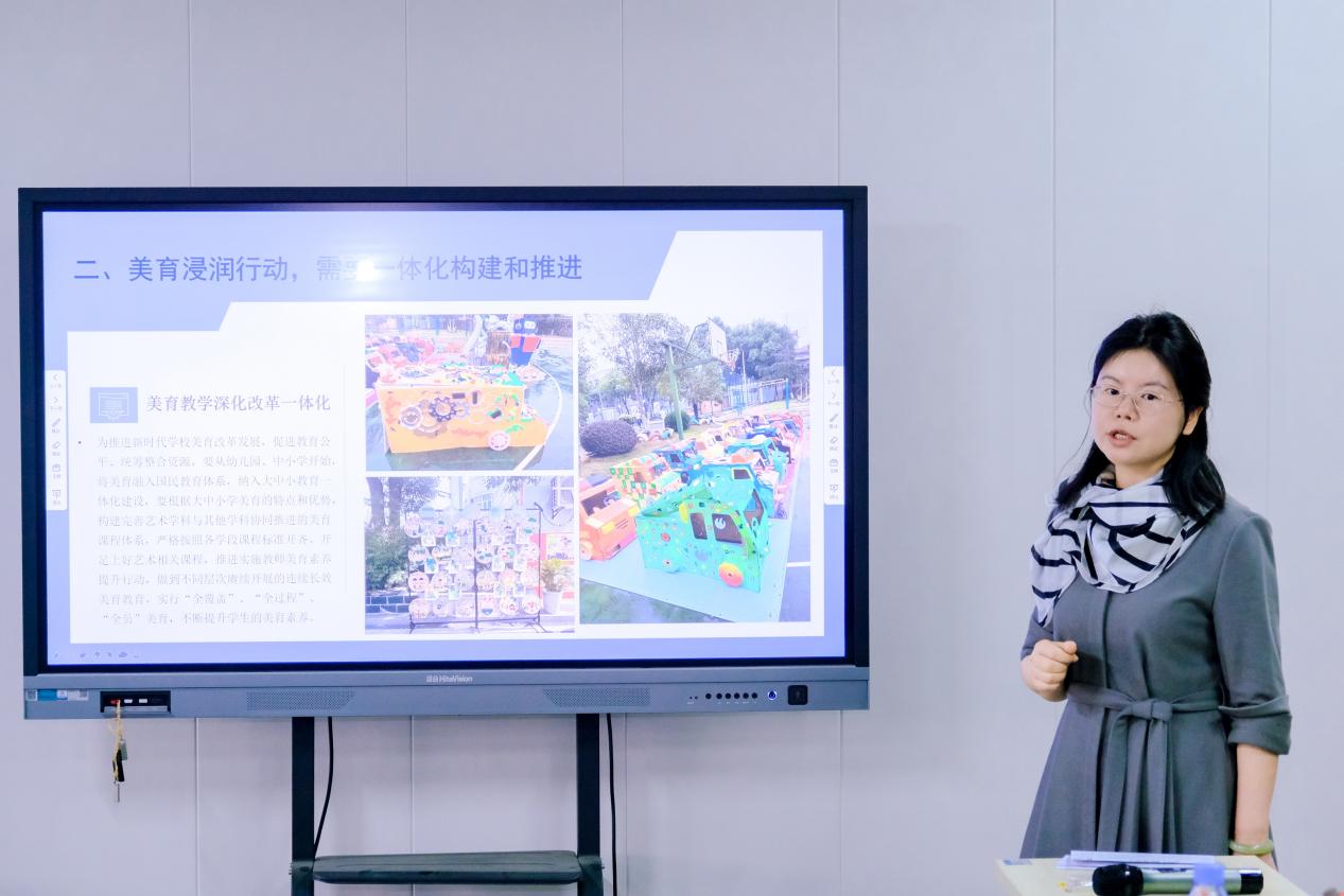 武汉市教育科学研究院美术教研员蔡颖莹老师的发言主题是《美育浸润的三个行动》。蔡老师提出:美育浸润行动,需要深化美育内涵的认识;美育浸润行动,需要一体化构建和推进;美育浸润行动,需要以制度、条件和评价为抓手;在思考与展望中提出推进美育浸润行动,以制度、条件为抓手,切实推进。