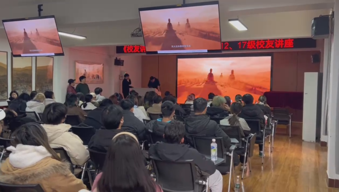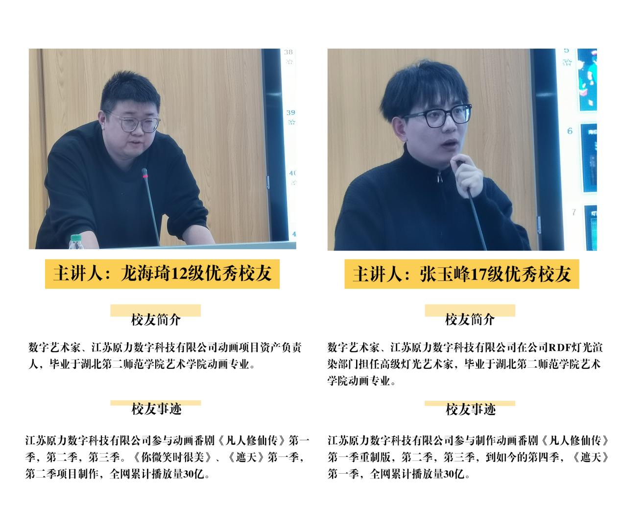在讲座中,专程从南京赶来的龙海琦和张玉峰校友分享了他们在职业生涯中的宝贵经验和心得体会。他们强调了艺术与科技融合的重要性,尤其是在当今数字化时代,这种结合不仅能够创造出更具视觉冲击力的作品,还能更好地发掘与传递中国优秀传统文化价值,增强文化自信。