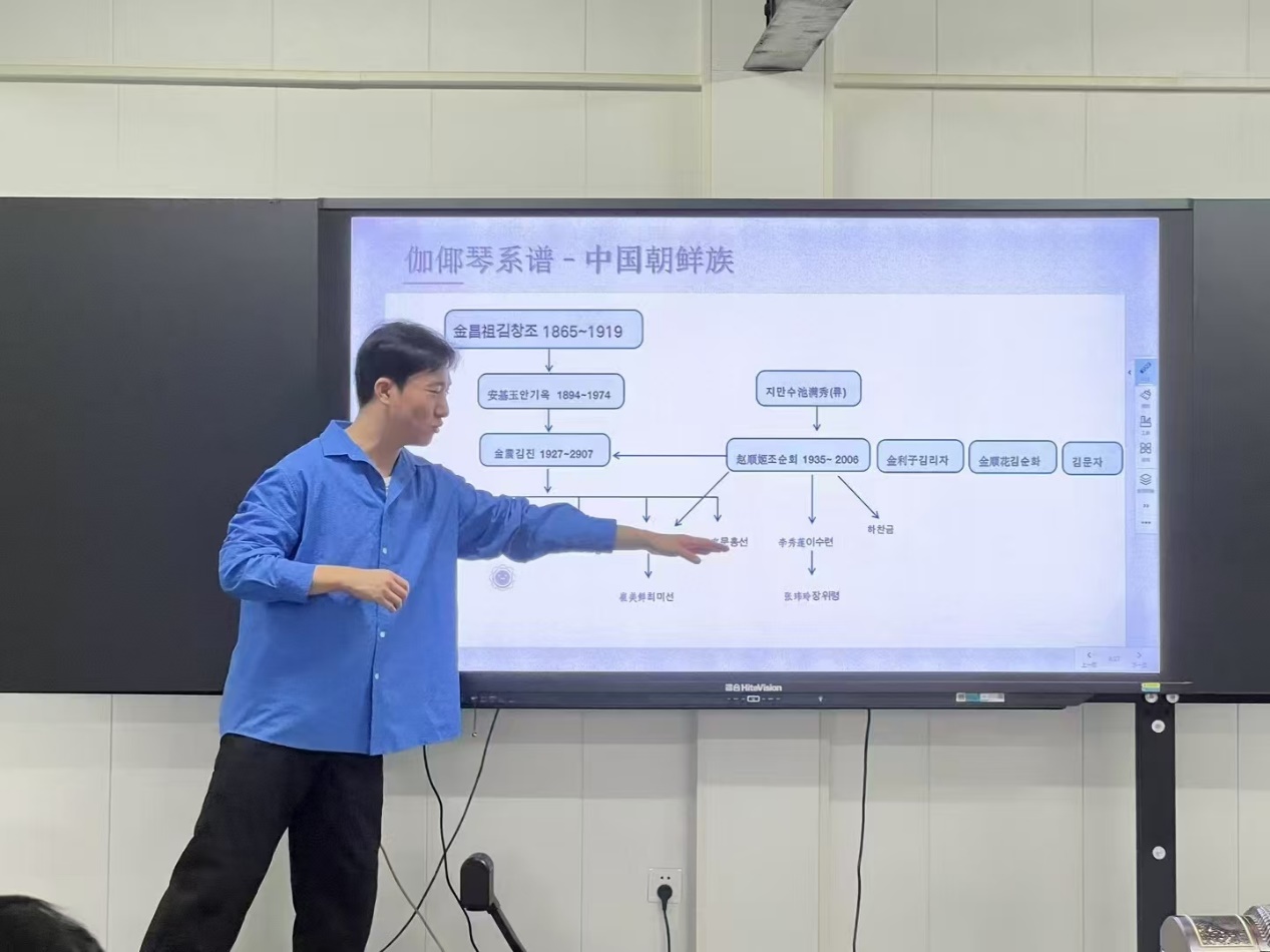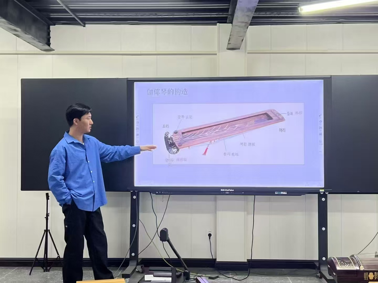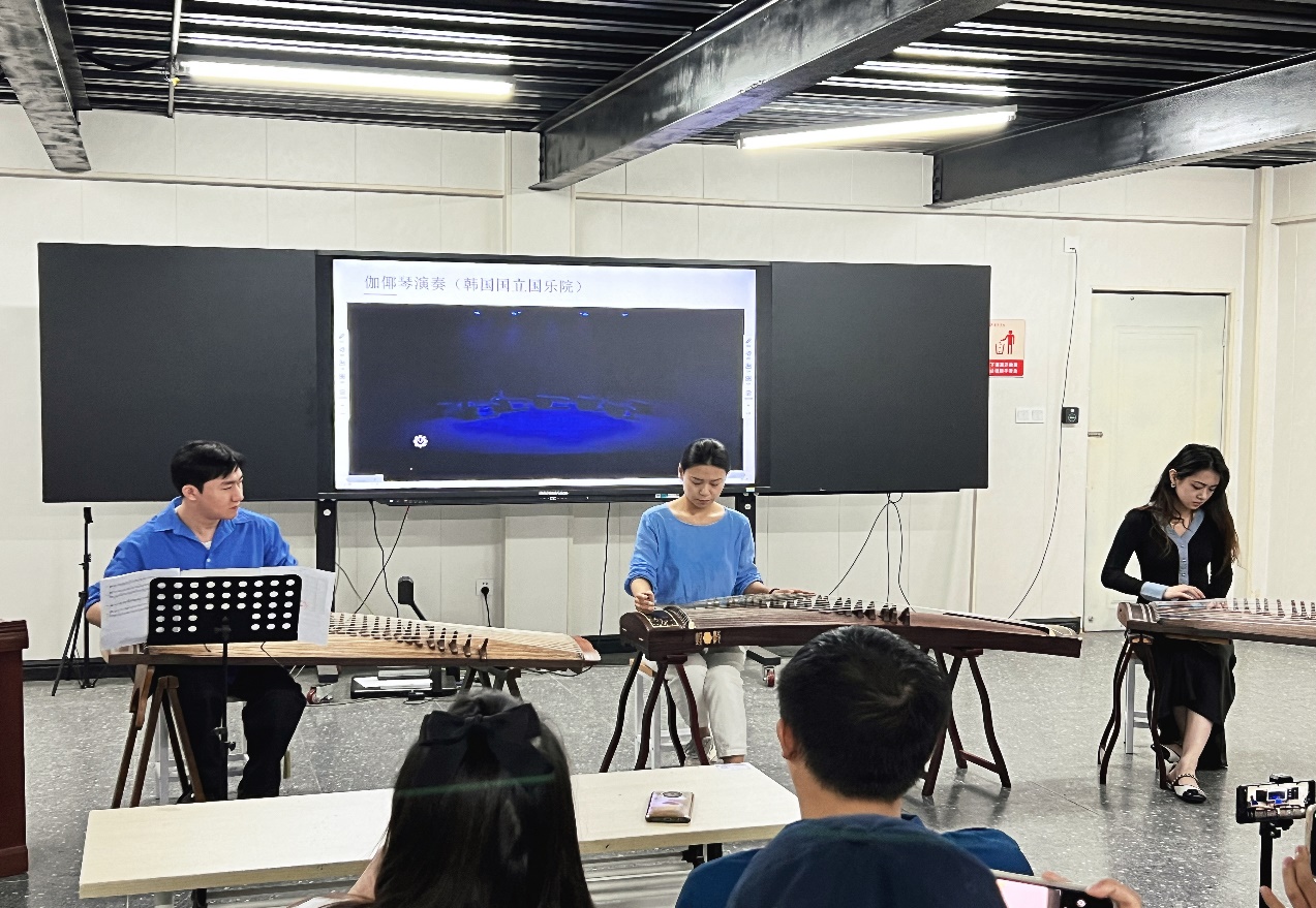 为了让同学们更直观的体验和理解伽倻琴与古筝的文化,李涛老师带领他的两位学生以娴熟的技法联手演绎古筝与伽倻琴的重奏表演唱《阿里郎》。李涛老师浅吟低唱,演奏如行云流水,随曲调渐高,余音绕梁,令人回味无穷。