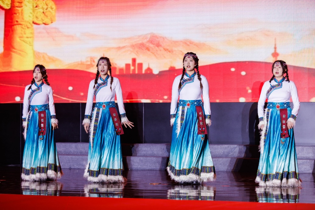 她们用柔美、清澈的声音演绎着这首藏族风格的歌曲。伴着明快的节拍和轻盈的舞姿把这首歌曲的浓郁的民族特色彰显得淋漓尽致,现在的观众不由的与台上的同学共同演唱,每个人的心灵在这一刻得到触动与升华。