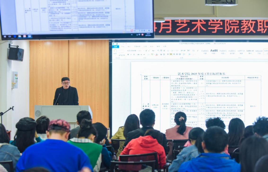 院长金波以《艺术学院2025年度工作目标任务书》为基础,为大家进一步明确了2025年工作要点,要求系部围绕专业发展相应地做好工作规划与任务部署,全体教师要把个人发展融入学院发展,争取在教学研究、项目申报和作品创作等方面取得新突破。