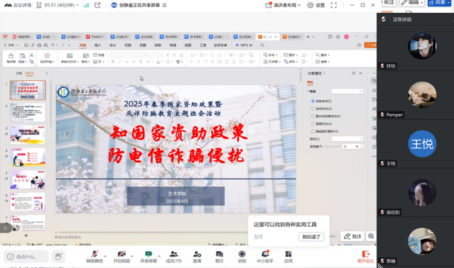 活动期间,大一、大三班级以线下班会形式,围绕国家助学贷款、奖助学金政策展开系统解读,同时结合刷单返利、冒充客服等典型案例,进行反诈防骗知识宣讲;针对处于实习阶段的大四毕业生,学院通过腾讯会议等线上平台开展主题教育,重点分析就业季常见诈骗手段,确保教育覆盖无死角。