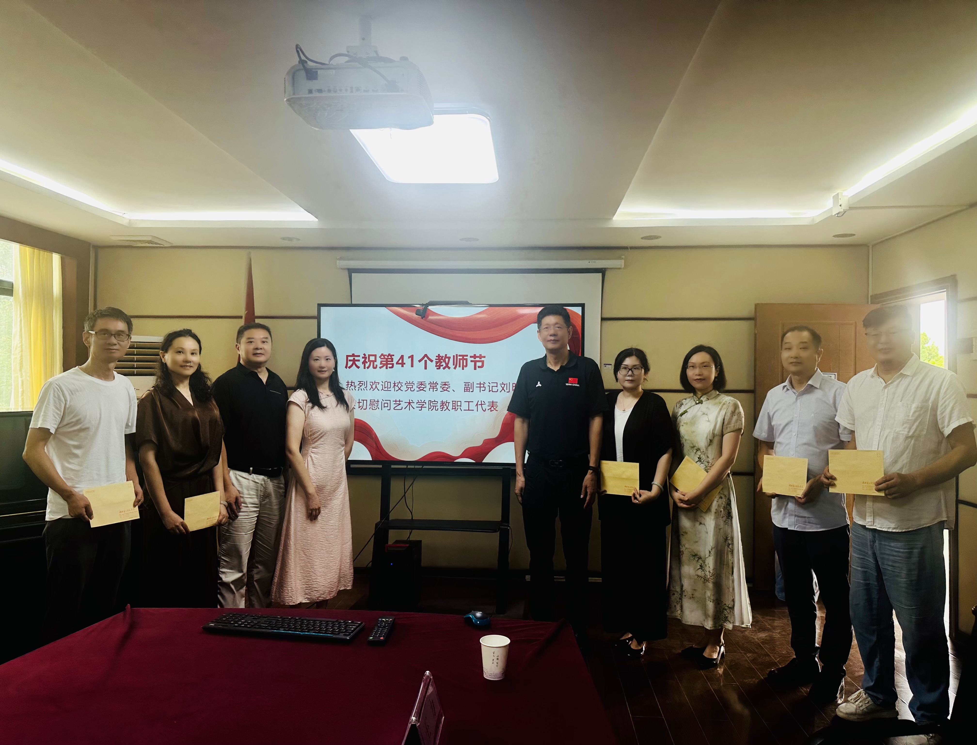本网讯(通讯员 王佩)2025 年 9 月 10 日上午,校党委副书记刘昕与保卫处处长吴健到学院开展教师节慰问活动,为广大教师送上节日祝福与诚挚问候。艺术学院党委书记章倩、院长金波全程陪同。