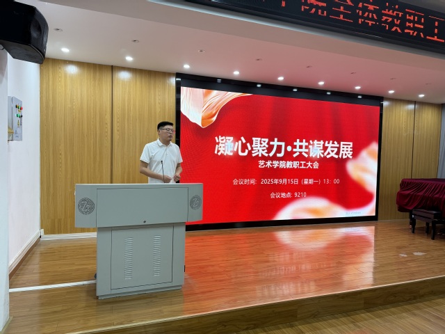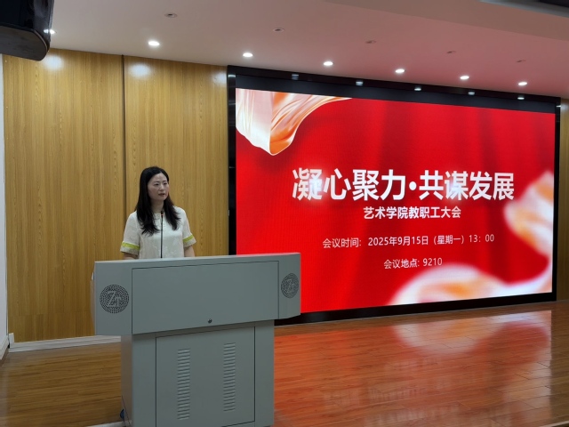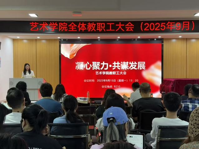 2025 年 9 月 15 日,艺术学院在9210召开新学年新学期第一次全体教职工大会。会议聚焦上半年的工作总结和新学期工作部署,为学院接下来的教学、科研、学科建设及就业等工作锚定方向,凝聚全院力量推动新学期各项事业稳步开展。