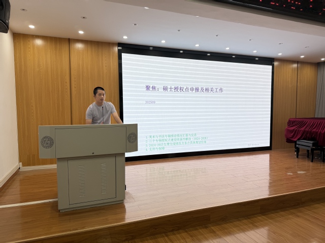 副院长赵文总结汇报了上学期的教学科研工作目标任务完成情况,介绍了学院三个专硕授权点申报的重难点,他号召全体教师要增强紧迫感,要以高站位、高层次、高质量标准推进硕士点建设。
