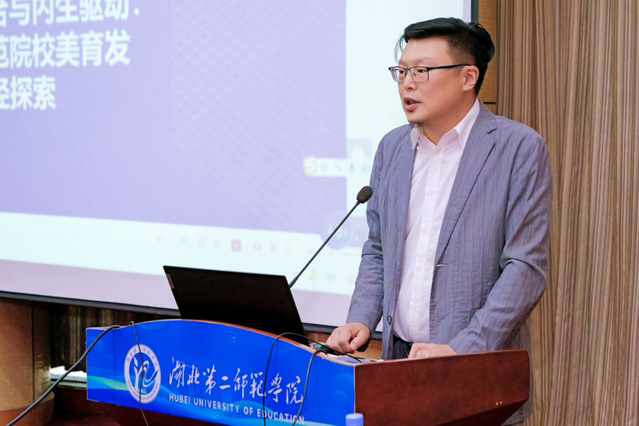 (通讯员吴科)2025年10月13日星期一下午14:00,“新时代·新美育·新使命——美育赋能教育高质量发展2025美育实践研究高峰论坛”在湖北第二师范学院行政楼一号会议室隆重举行。湖北第二师范学院艺术学院院长金波教授主持会议,并以《多维融合与内生驱动:地方师范院校美育发展的路径探索》为主题做主旨发言,深度解析地方师范院校在美育赋能教育高质量发展中的实践方向与核心路径。