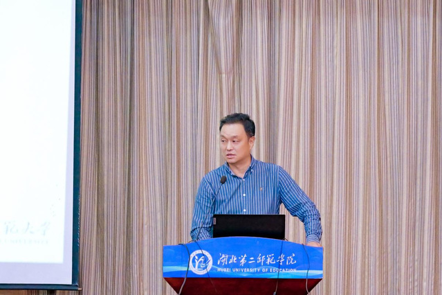(通讯员杨姝媞)2025年10月13日星期一下午14:00,“新时代·新美育·新使命——美育赋能教育高质量发展2025美育实践研究高峰论坛”在湖北第二师范学院行政楼一号会议室隆重举行。湖北师范大学音乐学院院长周有良教授带来了《以乐润心,赋能成长——黄石市老虎头小学音乐疗愈课实践分享》主题报告。