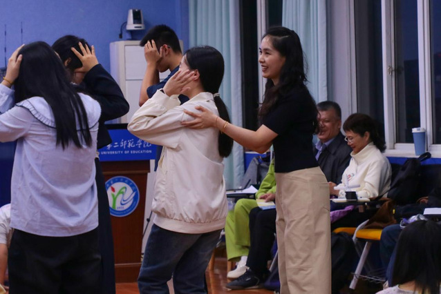 (通讯员 兰天佑)10月16日,作为“戏剧与教育融合理论与实践”国际会议报到首日的重磅开场,《戏剧游戏36计:从游戏到演出》工作坊在湖北第二师范学院火热开展。中央戏剧学院博士生李微阳、上海戏剧学院附中教师吴佳颖联袂带领,与参会代表及行知实验班学生共赴一场“戏”趣十足的专业实践之旅,现场互动热烈、氛围浓厚,让戏剧教育的魅力在沉浸式体验中充分释放。