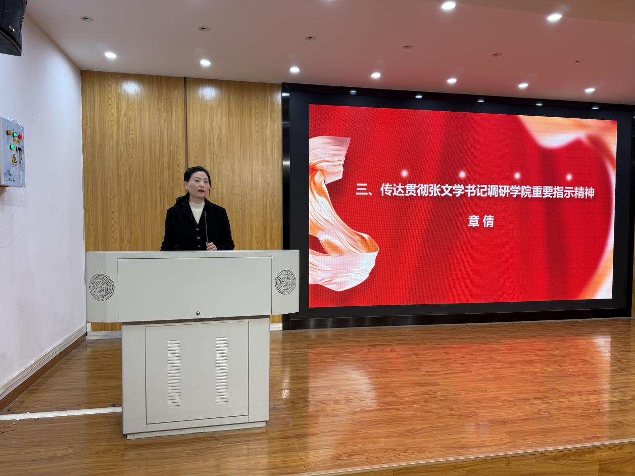 章倩传达了校党委书记张文学调研走访艺术学院时的重要讲话精神。她号召全体教职工,要继续发扬拼搏奉献精神,结合学院“十五五”发展规划,全面落实张文学书记提出的五点期望和要求,坚持立德树人、聚焦内涵建设提升人才培养质量、突出特色推动学科创新、增强服务社会能力、以扎实的党建为学院发展提供政治保障。