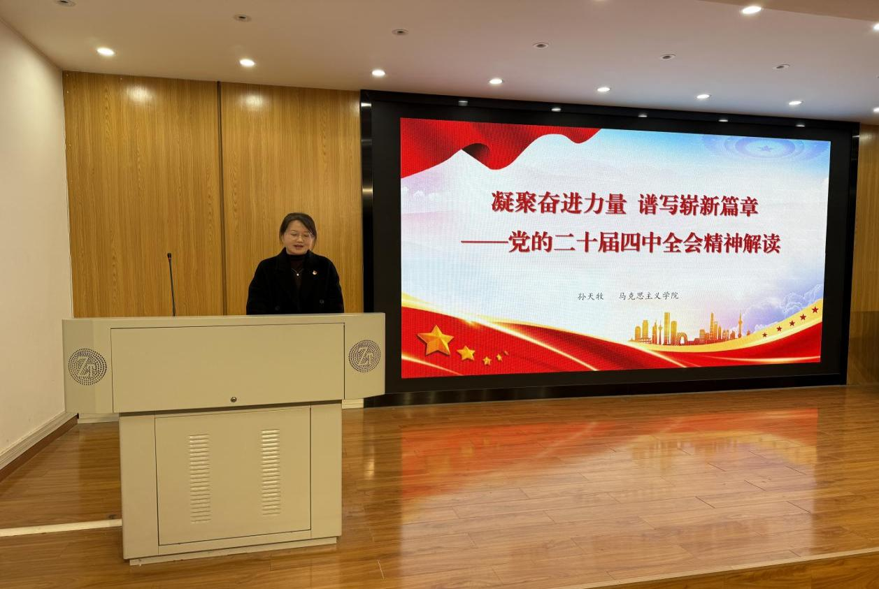 学校党的二十届四中全会精神宣讲团成员马克思主义学院青年教师孙天牧为全体教职工作宣讲,孙老师紧扣全会精神核心要义,介绍了“十四五”规划完成情况及取得成效,同时指出了国内外形势和中国式现代化任务,以及“十五五”规划主要内容和规划的亮点特点,并结合高校教育与艺术专业实际,以鲜活的案例、通俗的阐释,引导教职工深刻把握全会提出的新思想、新部署、新要求。