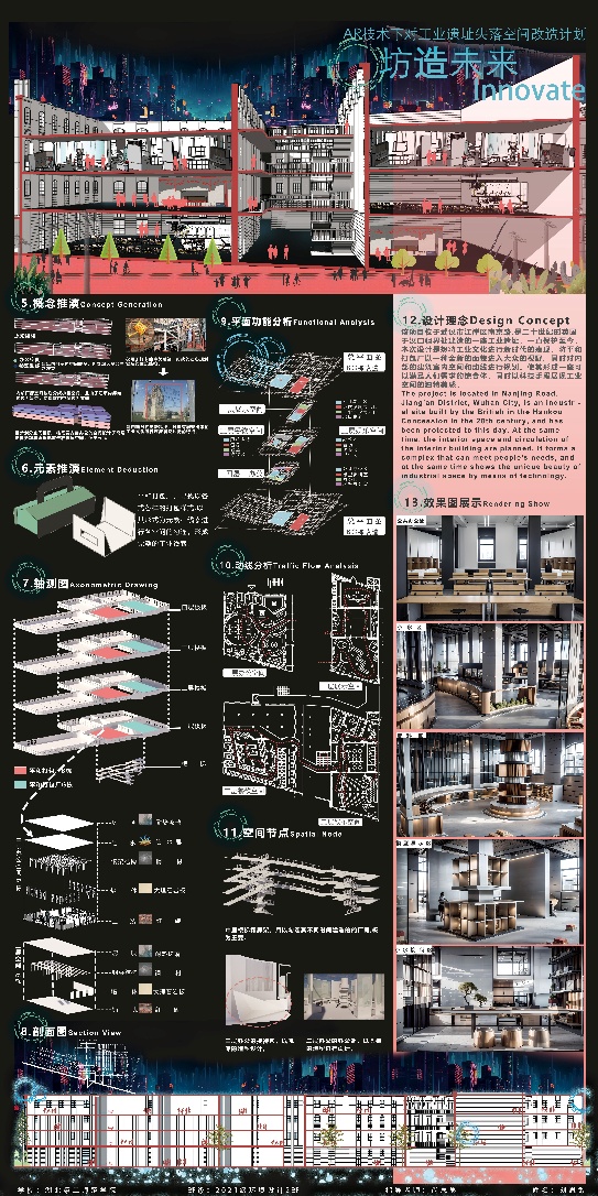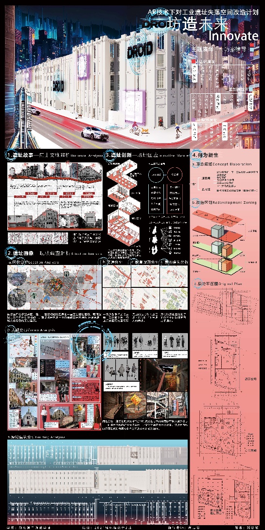 该作品聚焦工业遗址活化与数字技术融合前沿领域,创新性地将增强现实(AR)技术应用于工业遗址失落空间的更新改造中。作品从空间规划、视觉呈现到功能重塑,均展现出扎实的专业功底与独特的设计思维。在创作过程中,刘思敏同学在尚思思老师的指导下反复推敲方案,并多次赴武汉平和打包厂建筑旧址开展实地调研,深入探讨技术落地的可行性。通过对内部动线与功能的系统性重构,作品实现了外向型空间与多功能场景的统一整合,借助AR技术融入建筑功能表达,使原本利用率低、可达性弱的室内空间重焕生机,生动呈现工业建筑的文化内涵与历史底蕴。