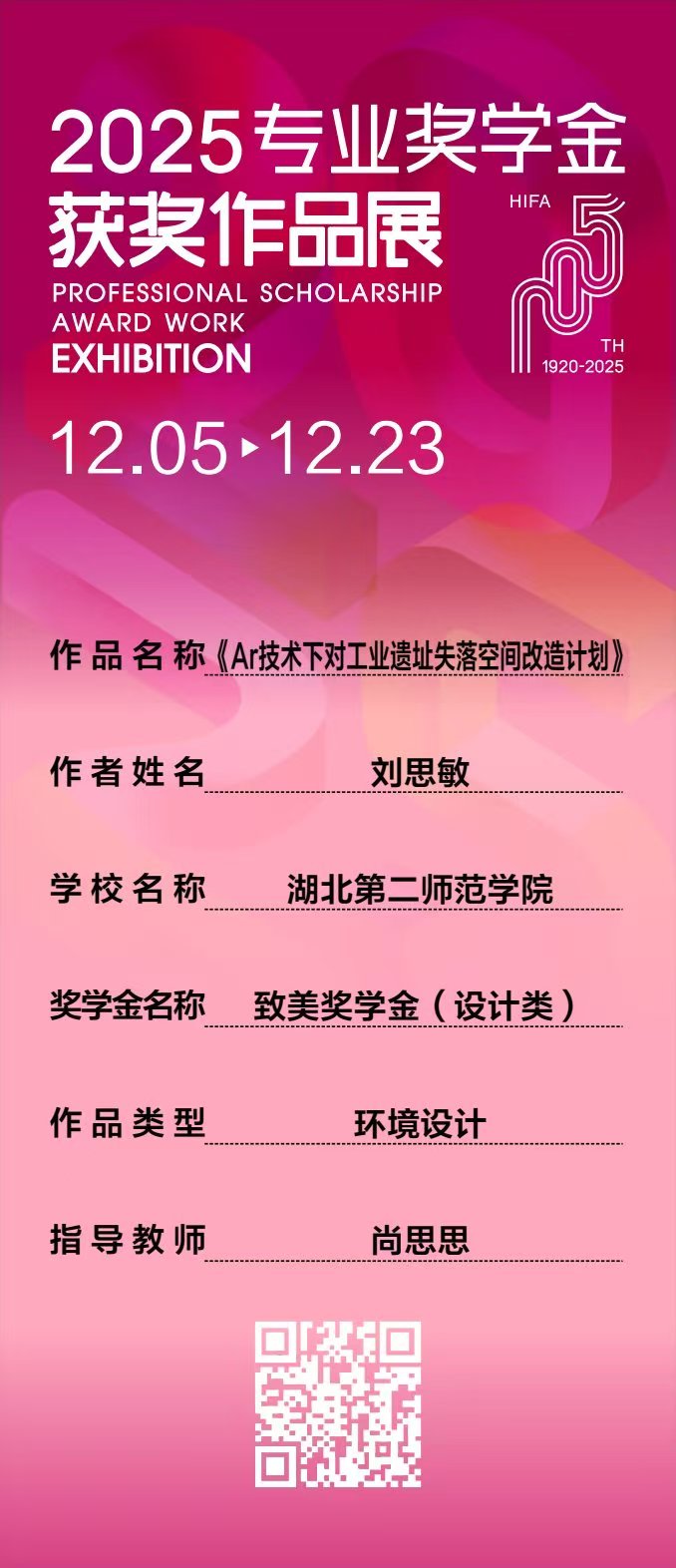 在本次评选中,我院环境设计系2021级优秀毕业生刘思敏同学的作品《AR技术下对工业遗址失落空间改造计划》,在专任教师尚思思的精心指导下,历经多轮严格评审,从近千件(组)参评作品中脱颖而出,荣获致美奖学金(设计类)优秀奖。