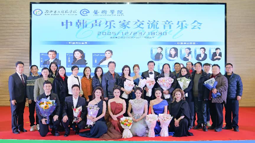 (通讯员 何雨晨)2025年12月23日晚,一场精彩的中韩声乐家交流音乐会在湖北第二师范学院艺术学院隆重上演。本次活动既是一场高水准的艺术盛宴,更是我院践行开放办学理念、推动国际艺术交流的生动实践。音乐会现场座无虚席,气氛热烈。艺术学院刘畅副院长在致辞中指出,音乐是跨越山海、连接心灵的语言,此次音乐会既是艺术的切磋,更是文化的交融与对话。